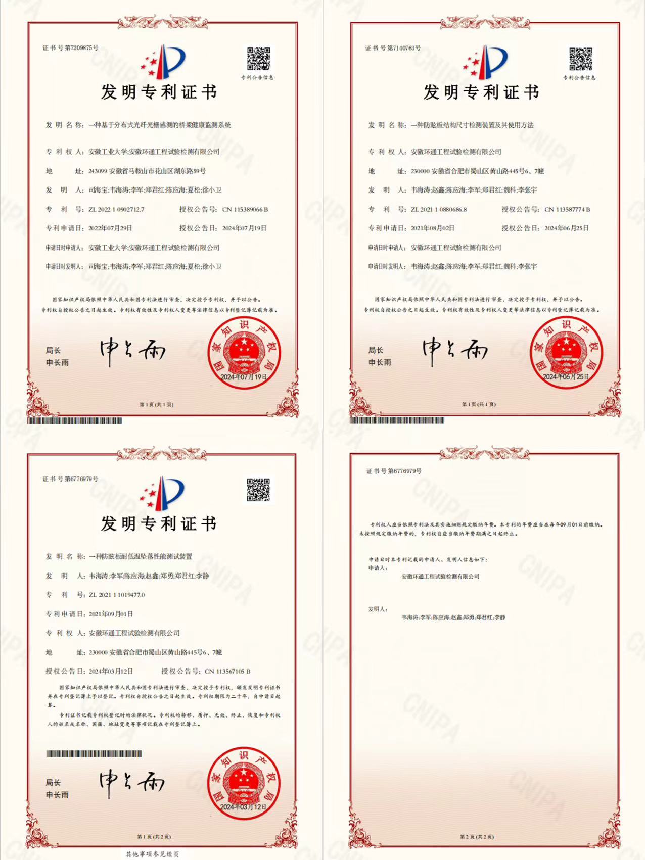 長期以來,環(huán)通公司始終把科技創(chuàng)新視為企業(yè)發(fā)展的核心動力,不斷加大研發(fā)投入,致力于攻克行業(yè)技術(shù)難題,推動產(chǎn)業(yè)升級。今年截至目前,環(huán)通公司共獲得三項國家發(fā)明專利授權(quán),另外兩項分別是自主研發(fā)的《一種防眩板結(jié)構(gòu)尺寸檢測裝置及其使用方法》和《一種防眩板耐低溫墜落性能測試裝置》。