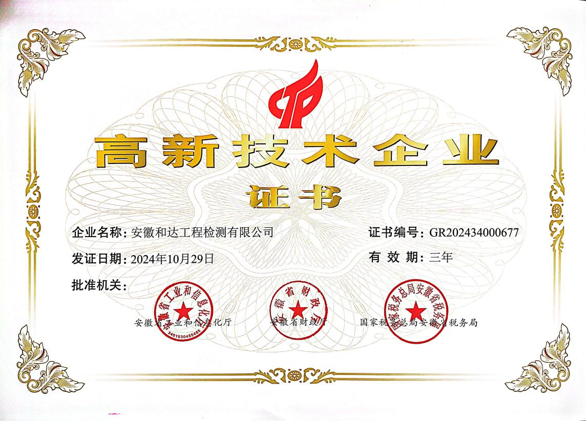 近日,建工檢測所屬子公司和達檢測順利通過高新技術企業認定,喜獲由安徽省工業和信息化廳、安徽省財政廳、國家稅務總局安徽省稅務局聯合頒發的國家級“高新技術企業”證書,成為建工檢測本部及所屬單位在內的第7家高新技術企業。