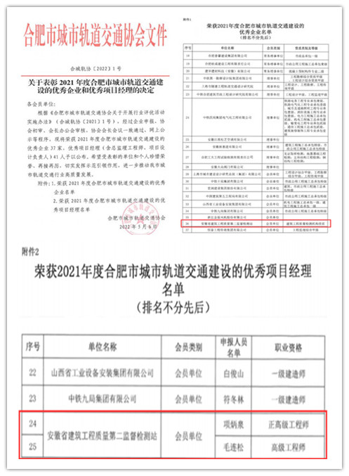 近期從合肥市城市軌道交通協會傳來喜訊,質檢二站獲評2021年度合肥市城市軌道交通建設“優秀企業”稱號。同時,黨委書記、董事長項炳泉、二站交通軌道檢測所副所長毛連松榮獲2021年度合肥市城市軌道交通建設“優秀項目經理”稱號。